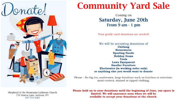 Our Annual Yard Sale is Coming Soon, Save Your Donations! Posted on April 14, 2026April 14, 2026 by Nancy Parisee